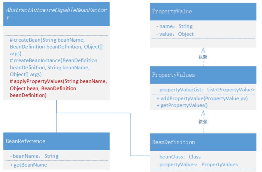在当前阶段的简化版本中,它只包含了 beanClass 字段,用来保存 bean 的 Class 对象,代替了Step1的Object,这样就可以把 Bean 的实例化操作放到容器中处理了。