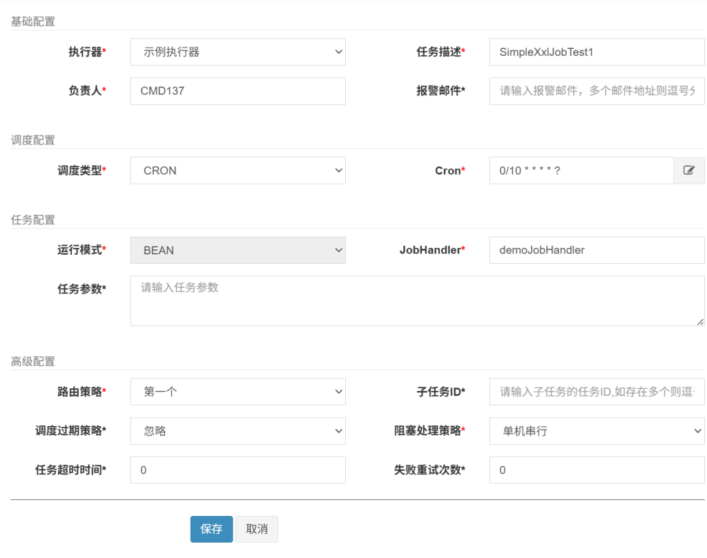 * - 在调度中心新建任务,执行器选择部署本Job的服务。