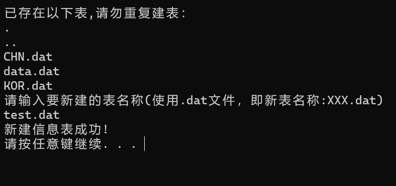 该系统仿照数据库的设计,在一个系统下管理多个不同的表,在源文件的案例中,我创建了CHN.dat与KOR.dat两个表分别储存中国棋手信息与韩国棋手信息。