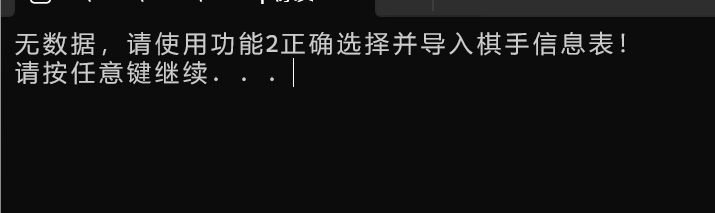 提示“无数据,请使用功能2正确选择并导入棋手信息表!”,按任意键返回主菜单。