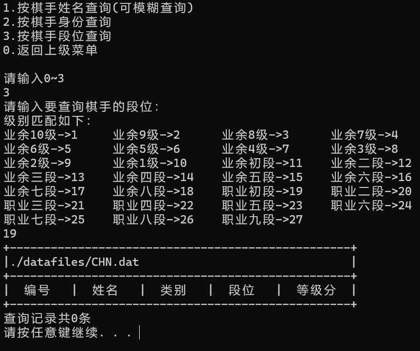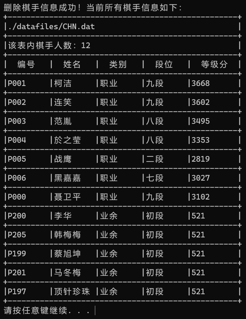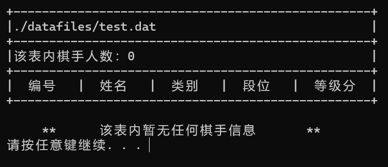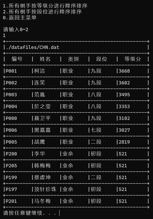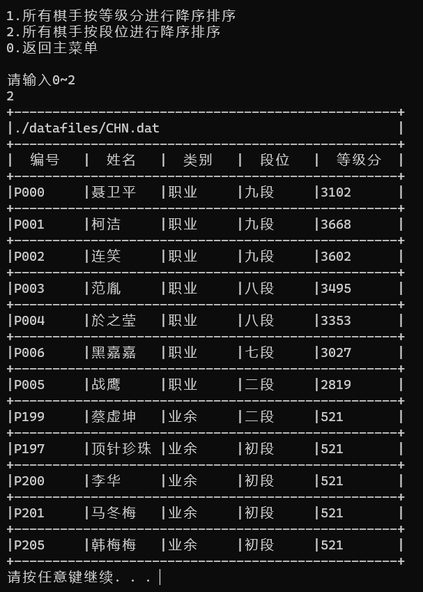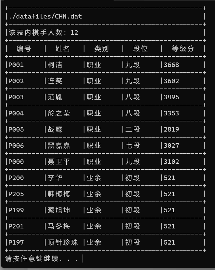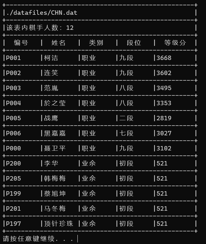 如图,打开一张有信息的表,最上方输出当前打开的表的名称,提示用户打开的是哪张表;第二行统计表内的总人数。第三行展示表的字段,依次为编号、姓名、类别、段位、等级分。再往下就是各个棋手的相应数据。按任意键返回主菜单。