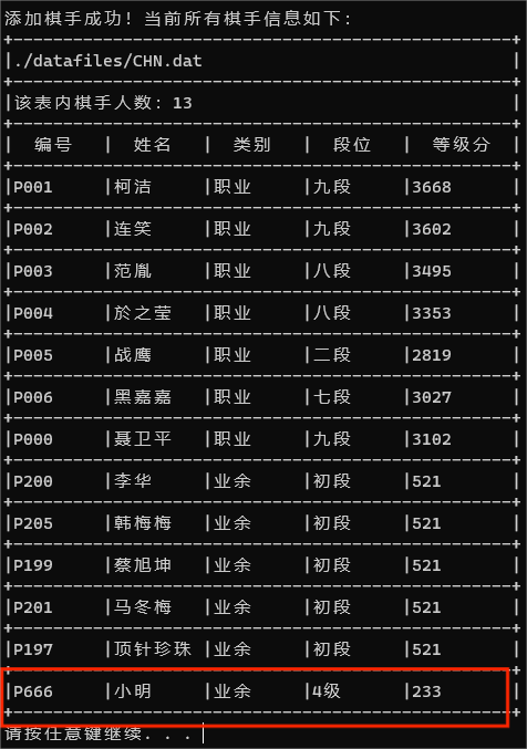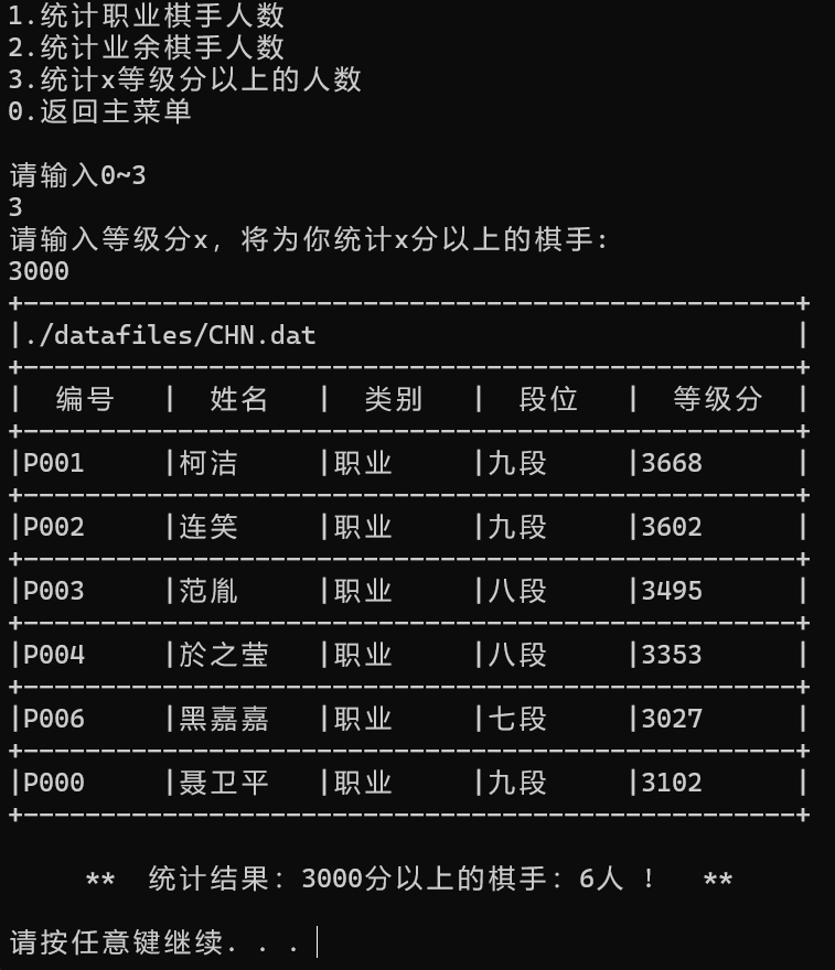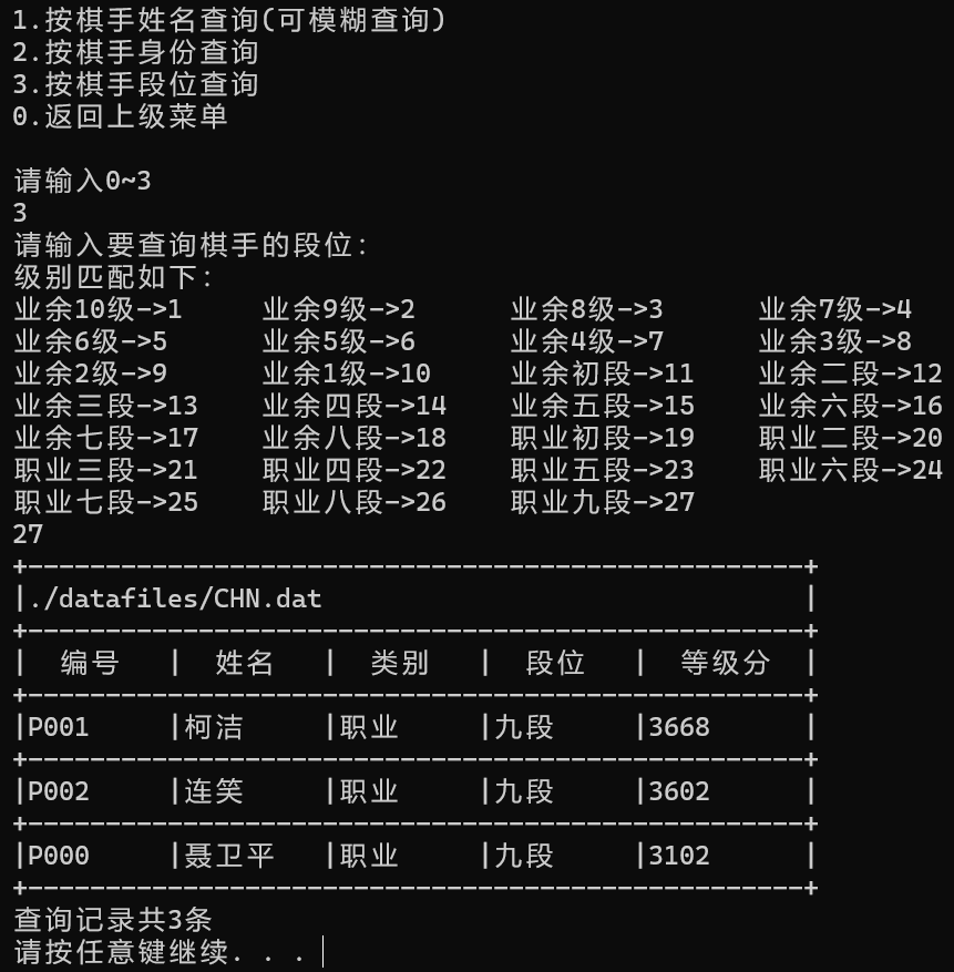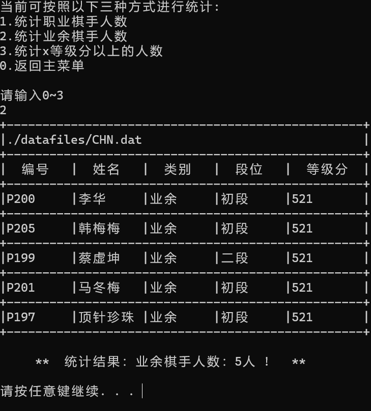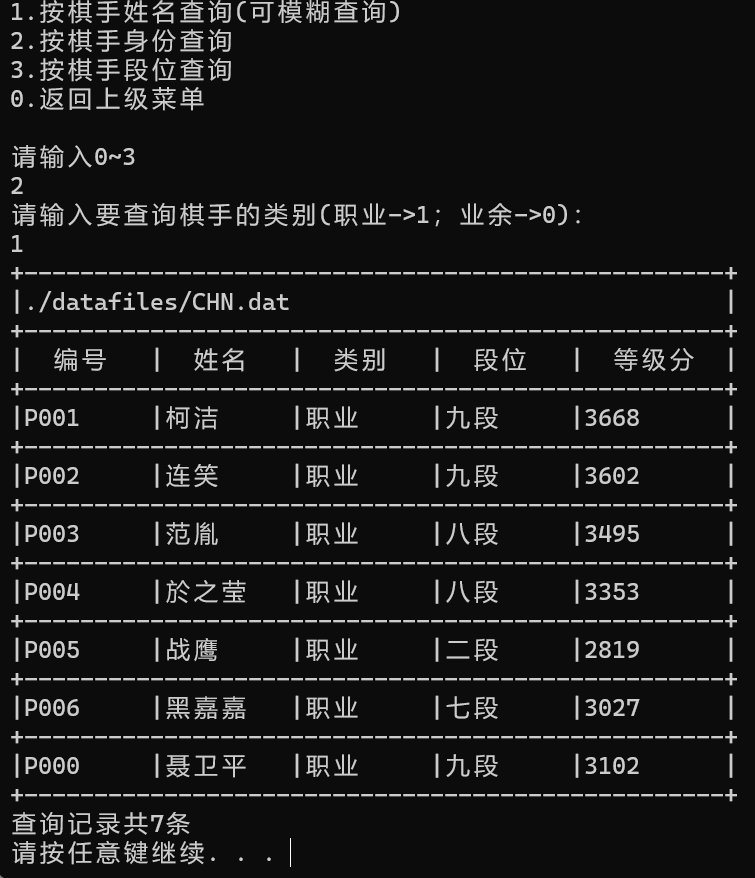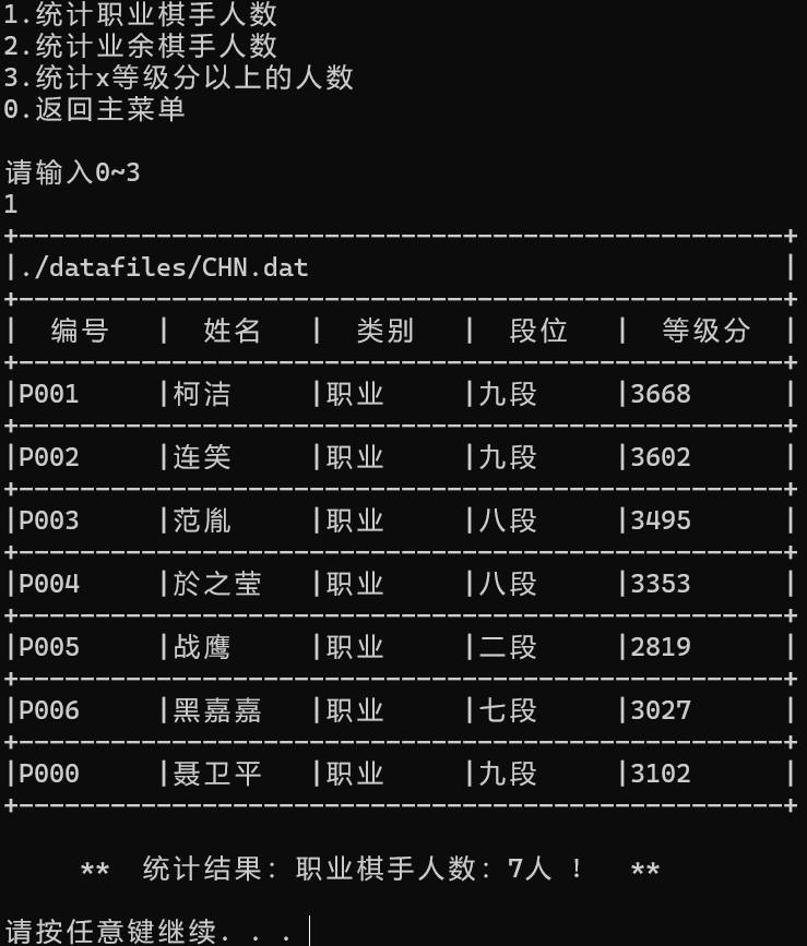 如图,打开一张有信息的表,最上方输出当前打开的表的名称,提示用户打开的是哪张表;第二行统计表内的总人数。第三行展示表的字段,依次为编号、姓名、类别、段位、等级分。再往下就是各个棋手的相应数据。按任意键返回主菜单。