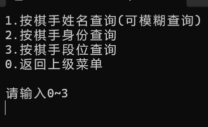 输入2。按棋手身份查询,系统提示输入要查询的类别,输入1,结果如下: