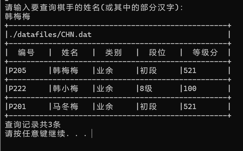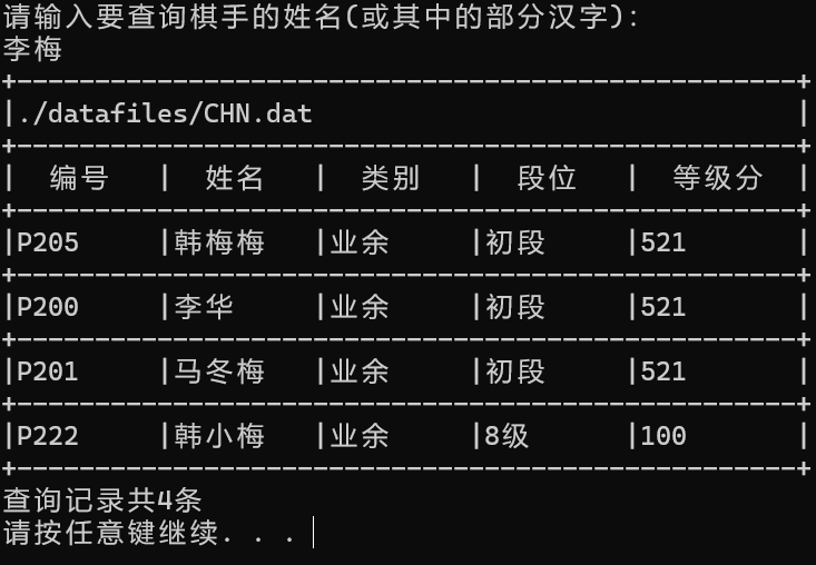 输入1。按棋手姓名查询,系统提示输入要查询的姓名,输入李梅,模糊搜索结果如下: