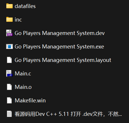 其他文件如Go Players Management System.dev为Dev C++ 5.11在搭建项目时产生的工程文件,若要完整的打开此项目,请如文本文件所提示的那样使用。