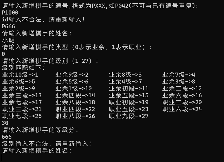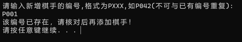 提示请输入新增棋手的编号,输入P001,结果如下: