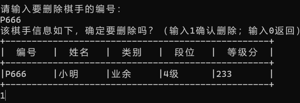 输入1确定删除,提示成功删除。操作成功后,显示所有棋手信息。