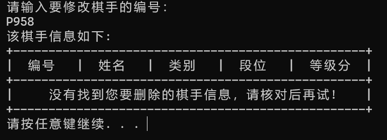 提示输入要修改棋手的编号:输入P958(不存在),提示没有找到: