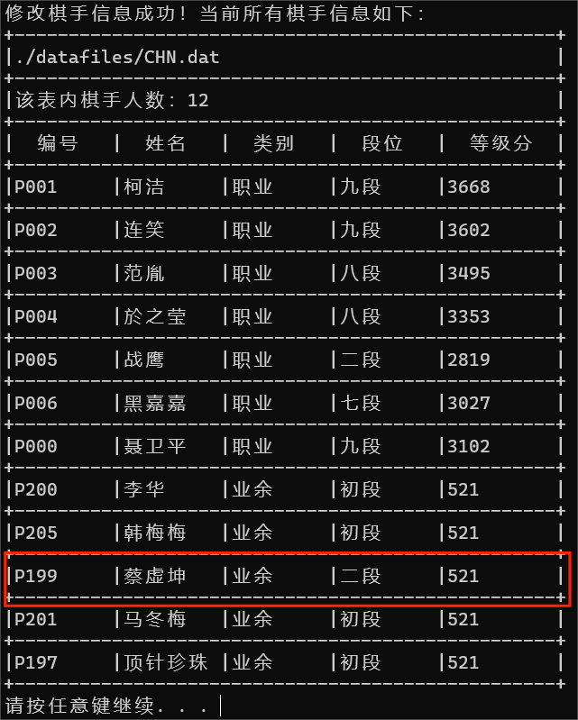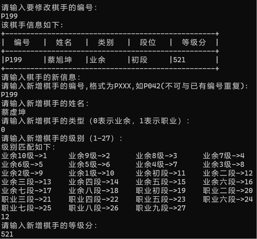 按下回车,提示成功修改。操作成功后,显示所有棋手信息。: