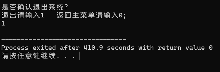 printf("退出请输入1 返回主菜单请输入0;\n");