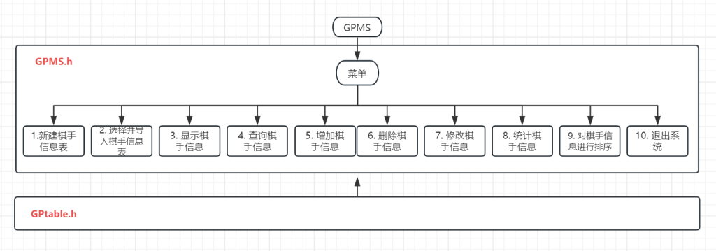 而在GPMS.h中调用十个功能函数时,有不少对棋手信息的操作是重复或类似的,为了不重复“造轮子”,我们选择把这些操作同样封装为函数,并全部在GPtable.h中定义,顺便在头文件中实现对棋手结构体的定义。