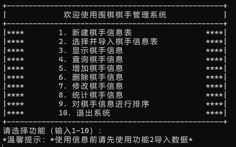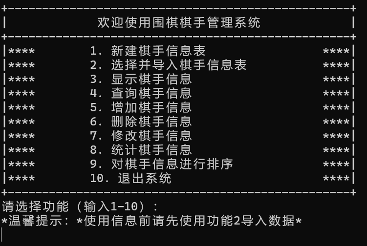 如图,主菜单最上方显示“欢迎使用围棋棋手管理系统”,在下方框中,居中列出10条主要功能。在最下方提示输入1-10来使用相应功能,并提示使用信息前请先使用功能2导入数据,提高对用户的友好性。