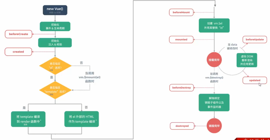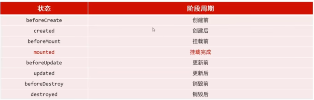 - mounted:挂载完成,Vue初始化成功,HTML页面渲染成功。主要用于发送请求到服务端,加载数据。