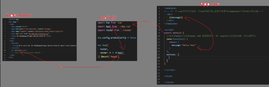 render:h=>h(App)// 将上面导入的app视图创建出对应的虚拟DOM元素,挂载到上面的#app