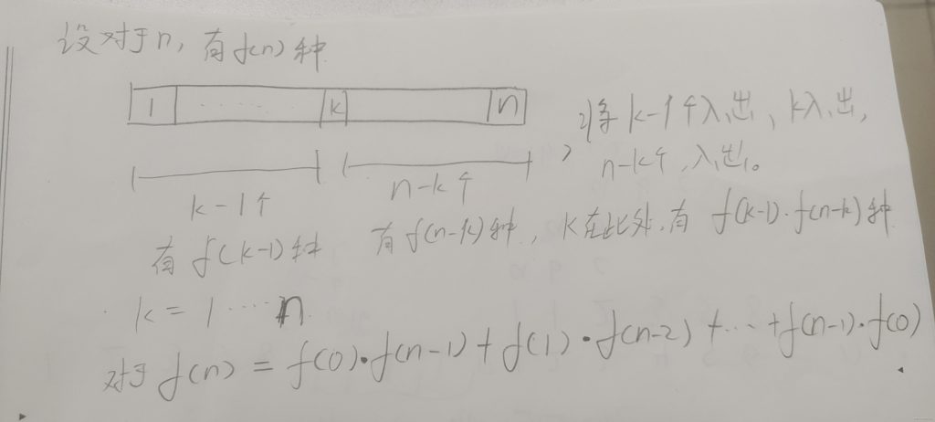 建立数组f[n],易得f[0]=1,f[1]=1,(由于k最小为1,f(2)=f(1-1)f(2-1)+f(2-1)f(1-1),我们至少举出f(1)、f(0)),通过循环依次递推出f(n),如下: